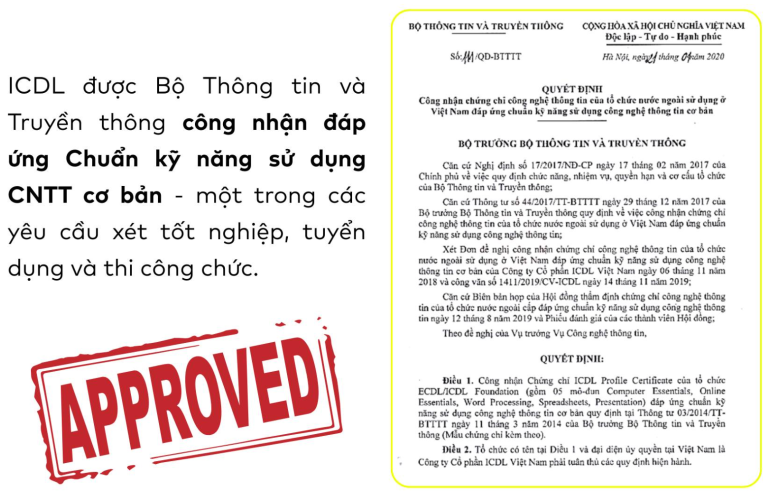 Ưu điểm nổi bật: ICDL là chứng chỉ tin học nước ngoài đầu tiên đáp ứng chuẩn kỹ năng sử dụng CNTT cơ bản của Việt Nam theo Thông tư số 03/2024/TT-BTTT ngày 11/03/2014 của Bộ CNTT&TT và đến nay là chứng chỉ tin học nước ngoài duy nhất còn đáp ứng các tiêu chí của thông tư này. Xem văn bản tại đây.